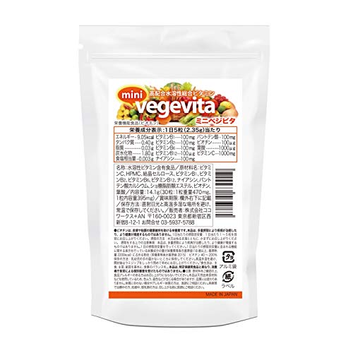 ミニベジビタは、「ベジビタ」の「ミニ」サイズのこと。摂りすぎても体外に流れていく水溶性ビタミンを、特に多く含むサプリで野菜の摂取量が少ない人にオススメです。