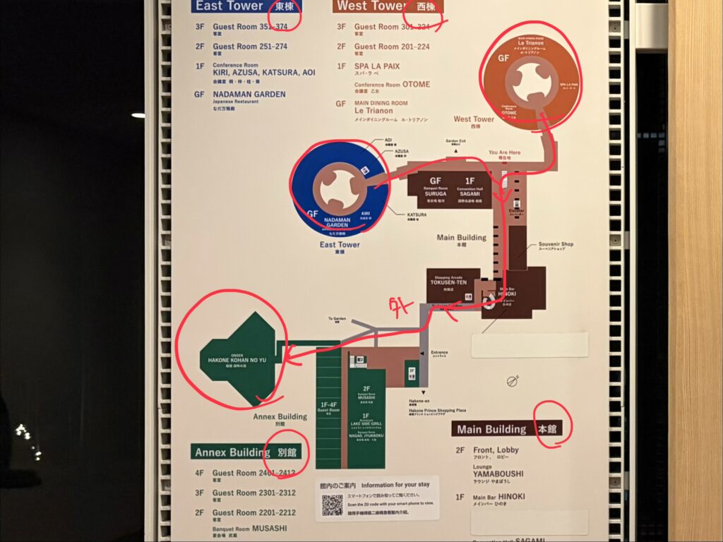 本館宿泊者は本館東棟・西棟ともに→別館へ移動します。